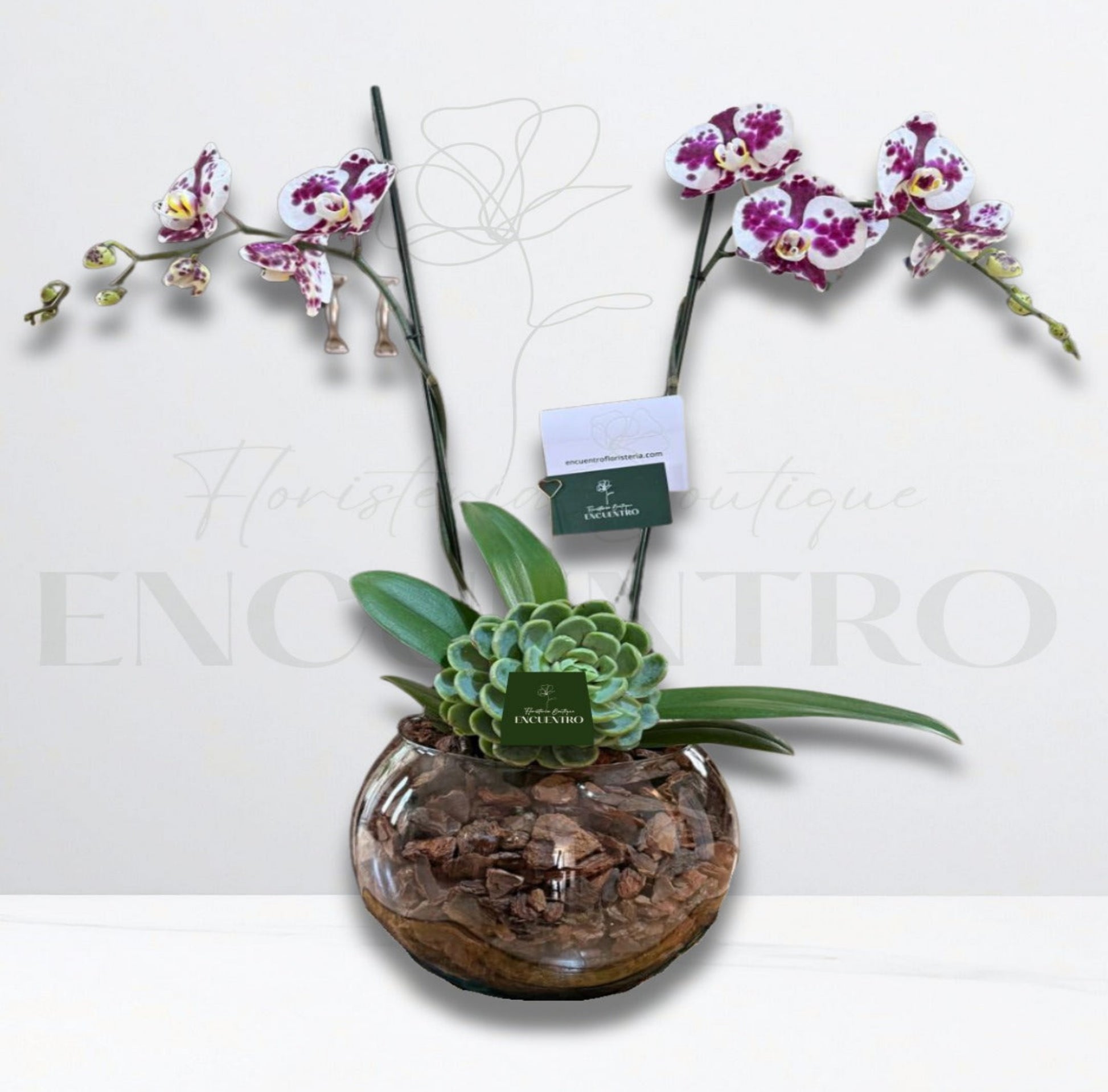 Orquídea de dos varas en base de cristal redonda grande, con suculentas.