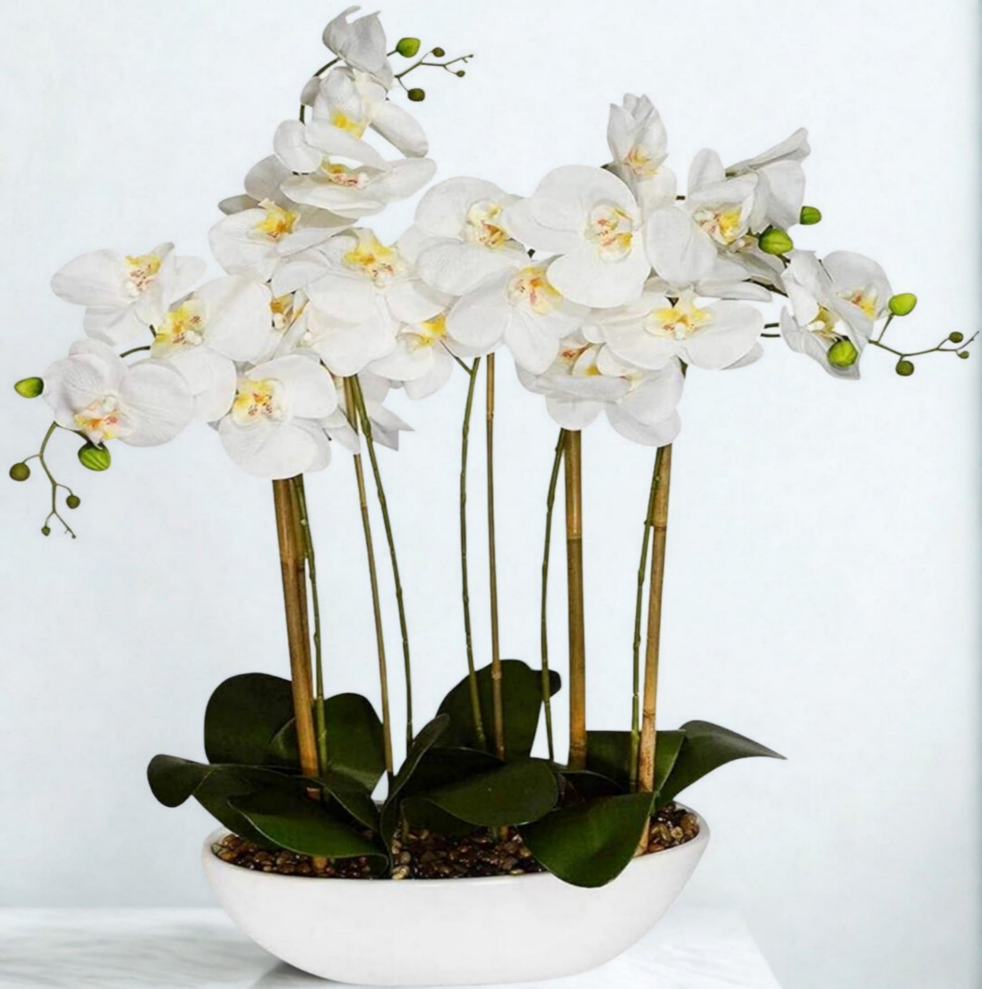 Seis varas de Orquídeas, presentadas un bol blanco de cerámica.