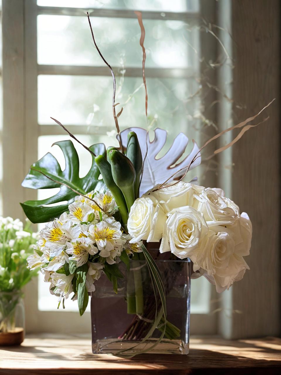 Ramo floral colocado en base de vidrio rectangular gruesa