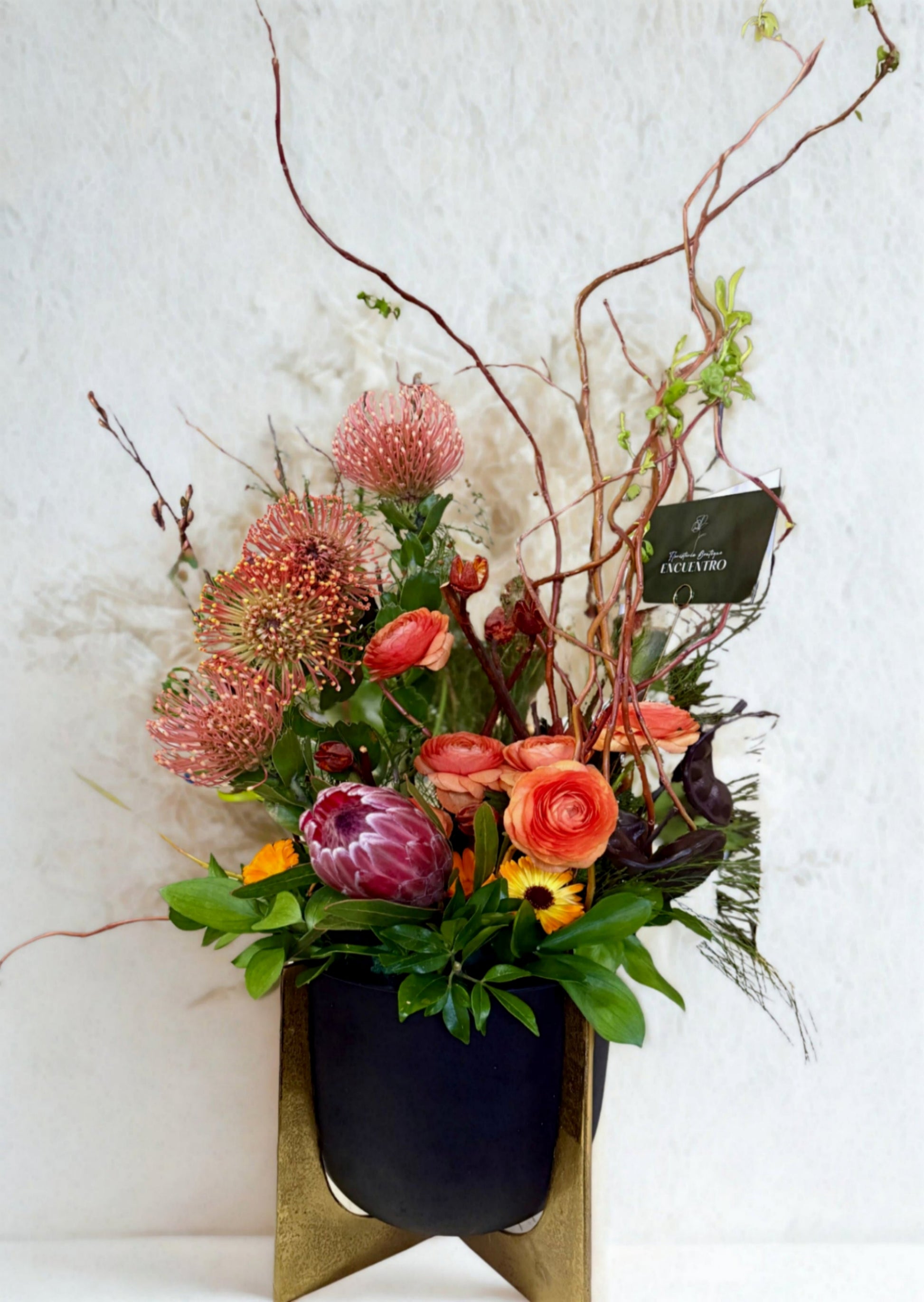 Diseño de protea cynaroides, zingiber, caléndulas y ranúncunculos en tonos naranja y melocotón, que incorpora ramas ocres y follaje verde oscuro.