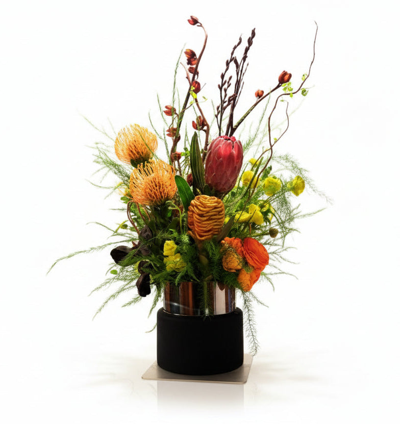 El arreglo incluye flores de Protea color naranja y borgoña, de jengibre y Ranúnculus tradicionales tono naranja y Ranúnculus mariposa en tono amarillo.