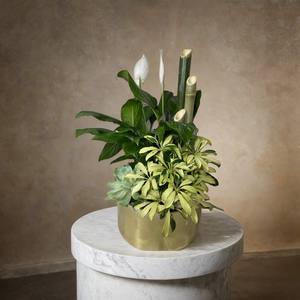 Oasis de plantas en base de cerámica dorada.