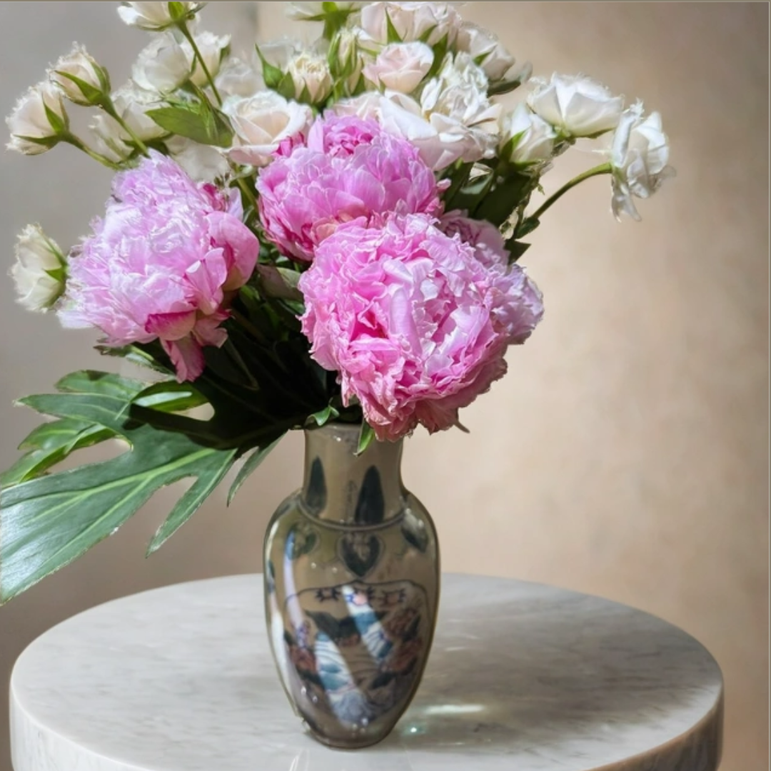 Arreglo floral presentado en un jarrón esmaltado vintage.