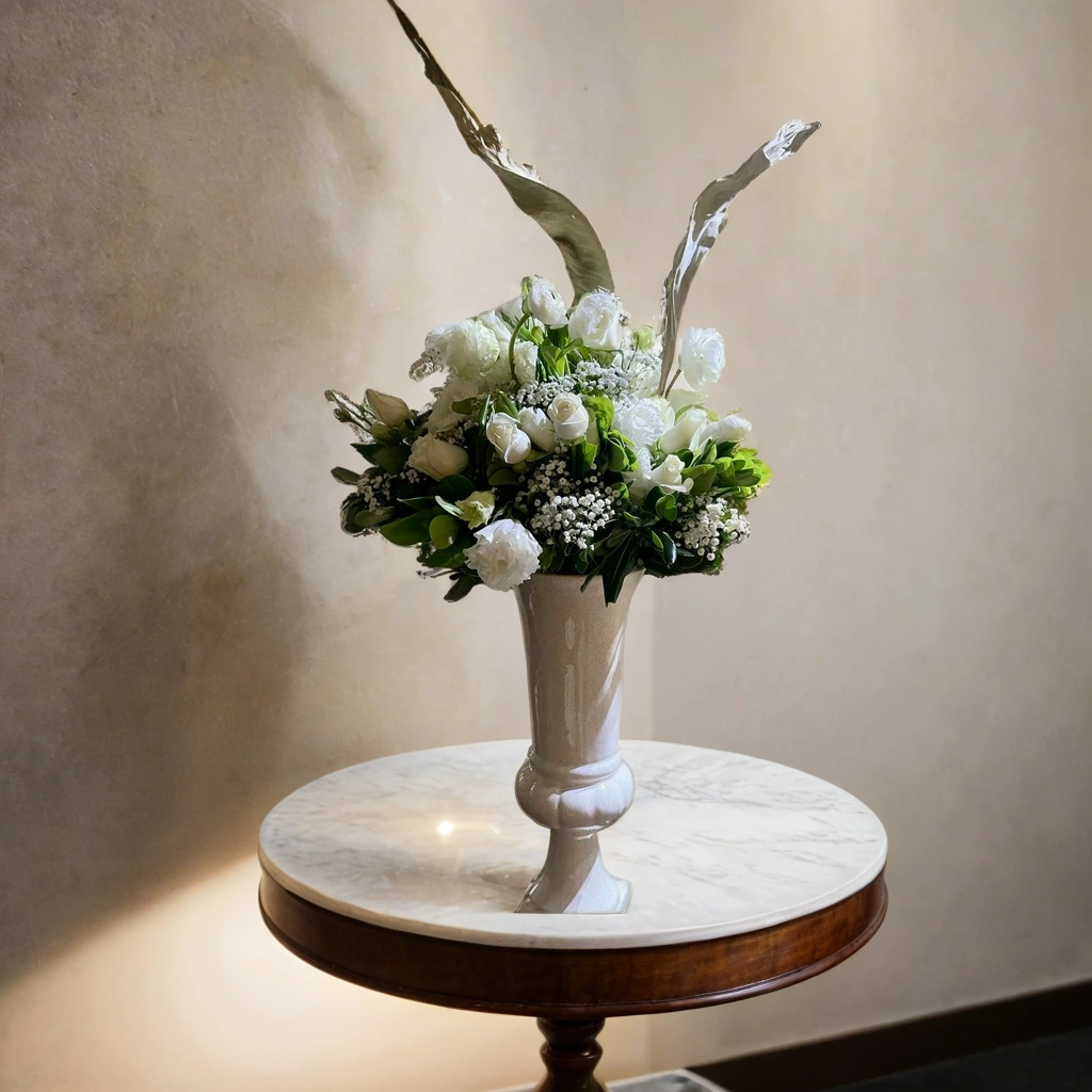 Arreglo floral e n base alta de cerámica tipo mármol.